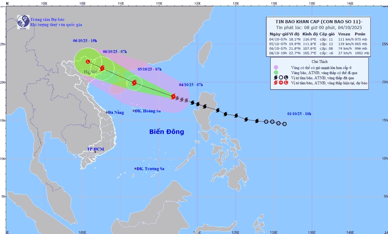 Theo dự báo của Trung tâm Dự báo khí tượng Thủy văn quốc gia, bão số 11 sẽ tiếp tục mạnh thêm lên cấp 12-13, giật cấp 15-16, di chuyển nhanh về phía bán đảo Lôi Châu và khu vực Vịnh Bắc Bộ; trong ngày 5 đến 7-10-2025, bão sẽ ảnh hưởng trực tiếp đến Vịnh Bắc Bộ, ven biển và đất liền nước ta, tiếp tục gây mưa lớn tại khu vực Bắc Bộ và Thanh Hóa, Nghệ An.
