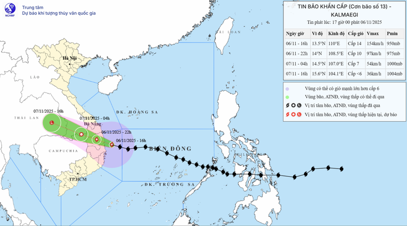 Dự báo, đến 4 giờ ngày 7-11, bão trên khu vực Nam Lào, sức gió mạnh nhất 7, giật cấp 9, di chuyển theo hướng Tây Tây Bắc với tốc độ 30 km/giờ và suy yếu dần thành áp thấp nhiệt đới... Khu vực ảnh hưởng là vùng biển từ Nam Quảng Trị đến thành phố Đà Nẵng (bao gồm đặc khu Lý Sơn, đảo Cù Lao Chàm) và Khánh Hòa; đất liền Nam Quảng Trị đến thành phố Đà Nẵng, phía Nam tỉnh Đắk Lắk và phía Bắc tỉnh Khánh Hòa với cấp độ rủi ro thiên tai cấp 3.