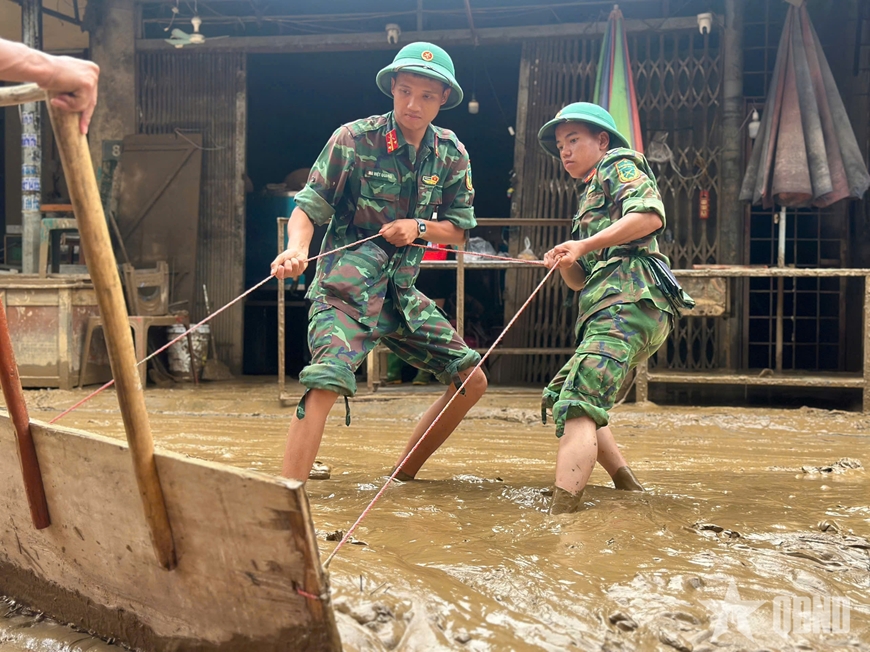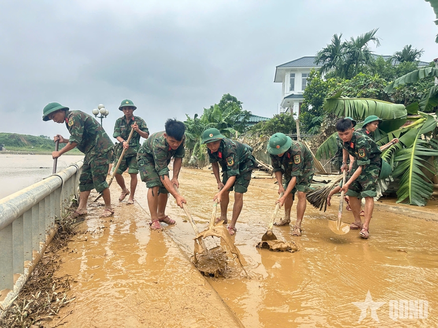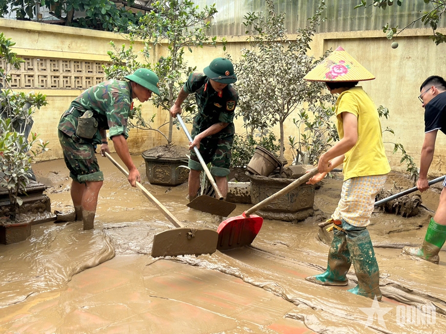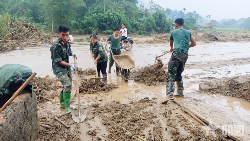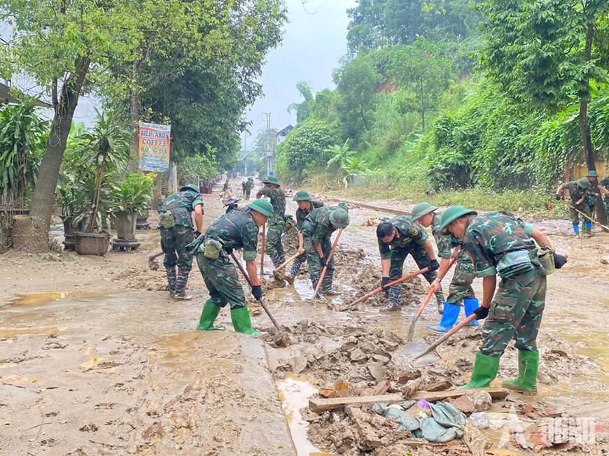 Từ 5 giờ sáng 2-10, Trung đoàn 174 (Sư đoàn 316, Quân khu 2) tăng cường hơn 190 cán bộ, chiến sĩ tham gia hỗ trợ người dân tỉnh Lào Cai khắc phục hậu quả bão lũ.