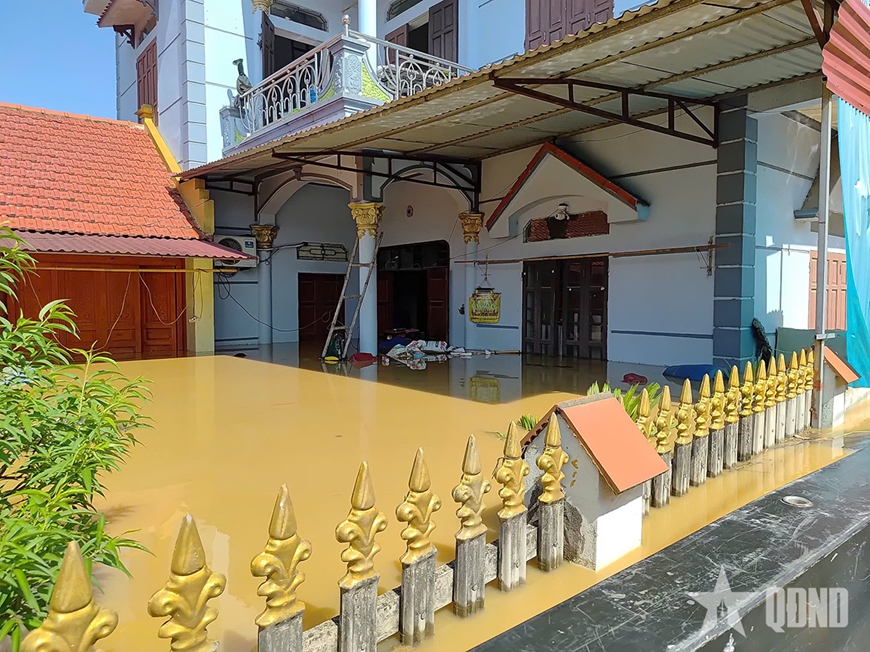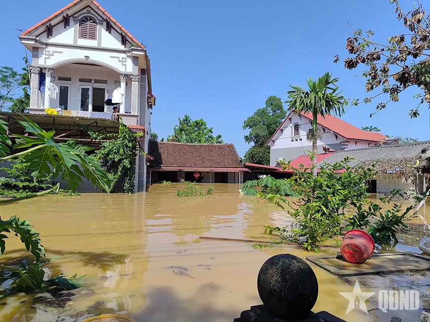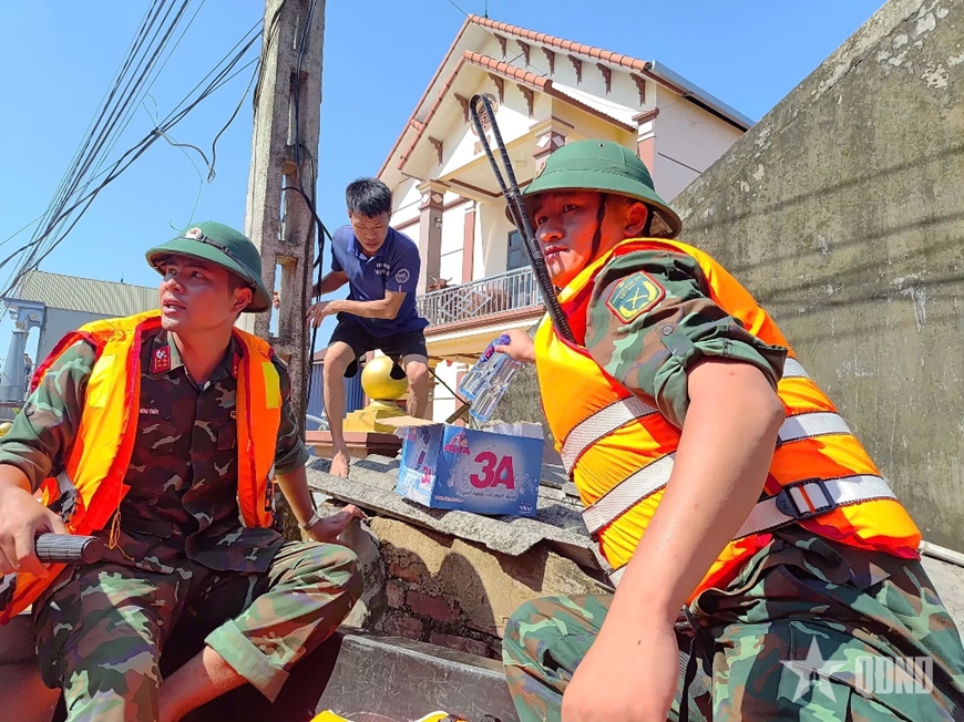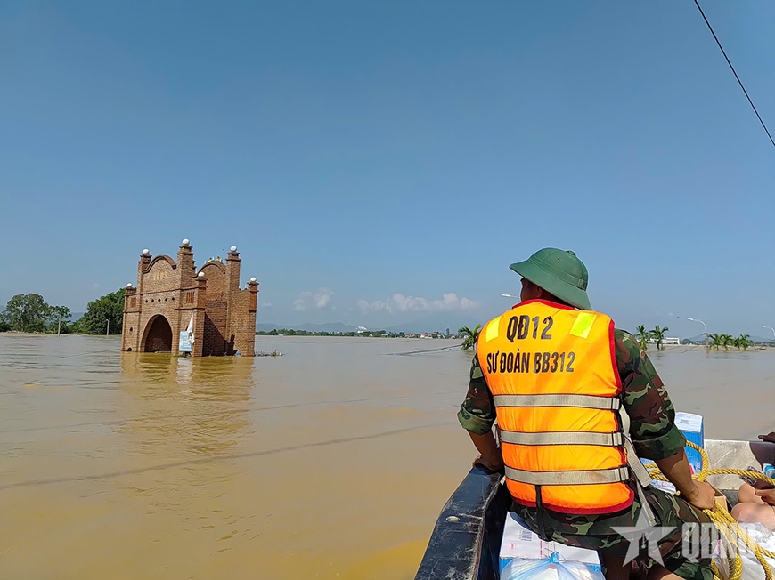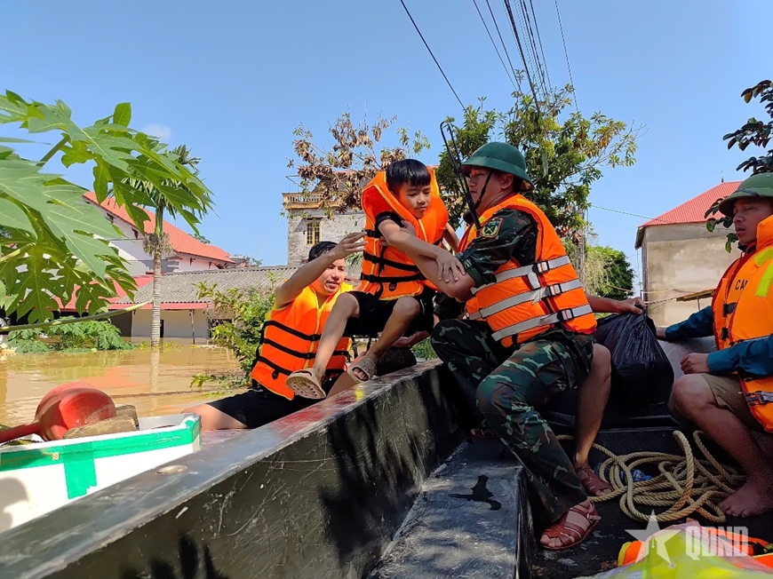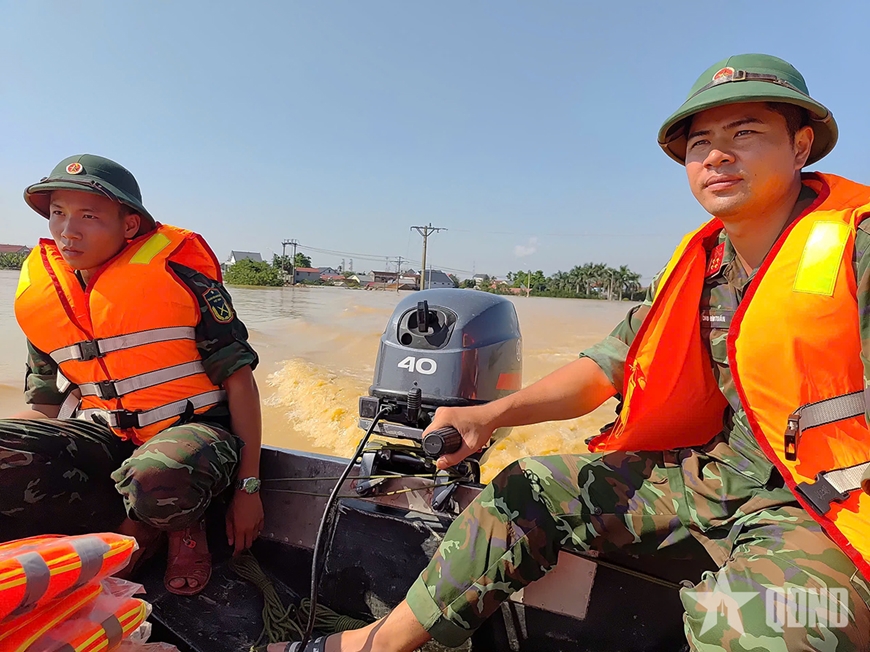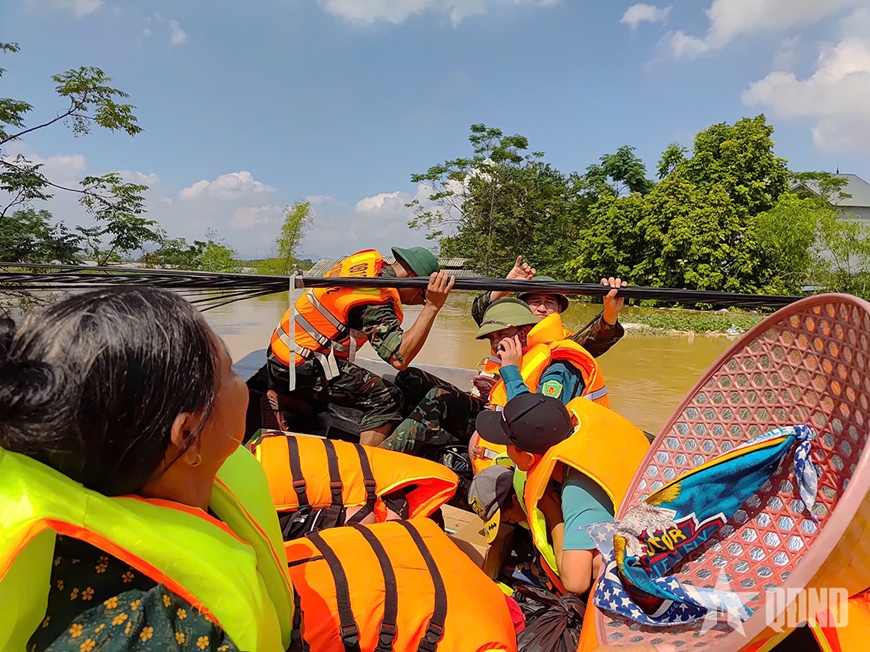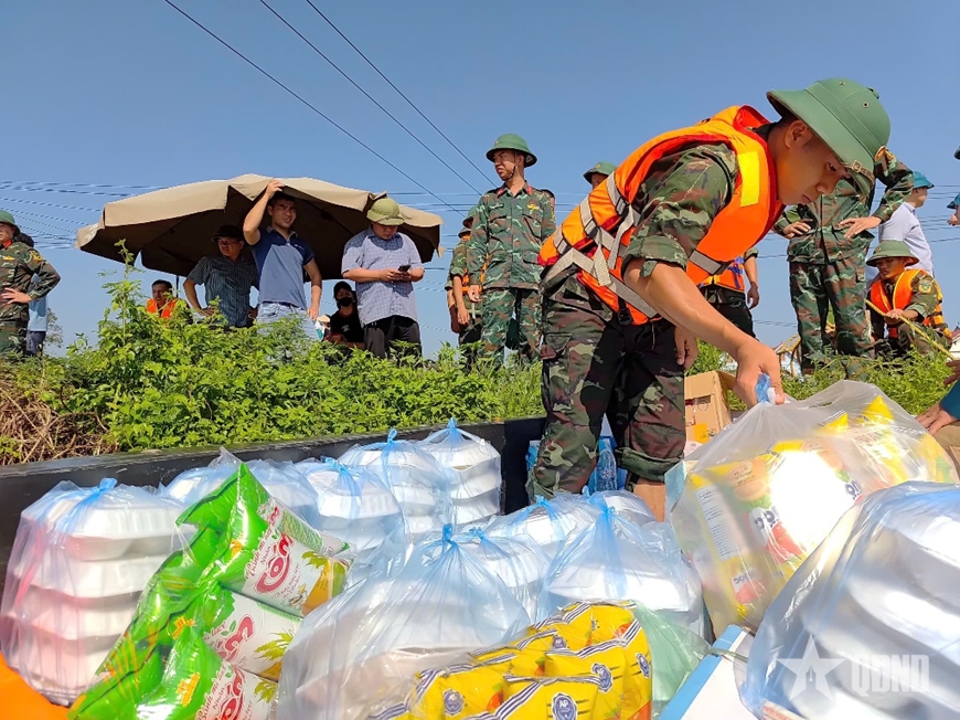 Trong buổi sáng 9-10, Trung đoàn 209 đã tổ chức 3 chuyến đưa cơm nhu yếu phẩm tới người dân vùng ngập lụt; đưa người già, trẻ em ra vùng an toàn.