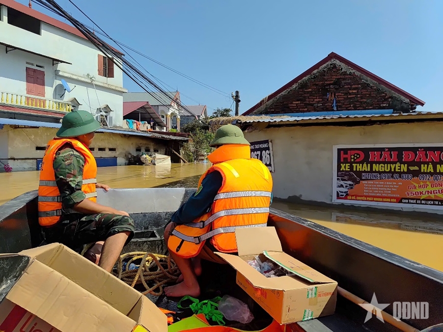Trung đoàn 209 (Sư đoàn 312, Quân đoàn 12) đưa cơm, nhu yếu phẩm tiếp cận người dân bị ngập lụt ở khu vực Phú Cốc, phường Trung Thành, tỉnh Thái Nguyên.