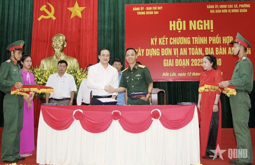 Tại hội nghị, Đảng ủy, Ban chỉ huy Trung đoàn 584 và lãnh đạo UBND các xã, phường ký kết chương trình phối hợp giai đoạn 2025-2030, về xây dựng đơn vị an toàn, với mục tiêu: 100% cán bộ, chiến sĩ Trung đoàn 584 có bản lĩnh chính trị vững vàng, tuyệt đối trung thành với Đảng, Tổ quốc, nhân dân; các tổ chức đảng đạt trong sạch vững mạnh, cơ quan đơn vị vững mạnh toàn diện, không có đảng viên, quân nhân vi phạm nghiêm trọng kỷ luật Đảng, kỷ luật Quân đội; chấp hành nghiêm các quy chế, quy định về bảo vệ bí mật của Đảng, Nhà nước và Quân đội.