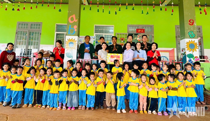 Thượng tá Đỗ Văn Tráng, Chính ủy Trung đoàn 726 cùng các nhà hảo tâm trao quà tặng cô và trò Trường Mầm non Sao Mai.