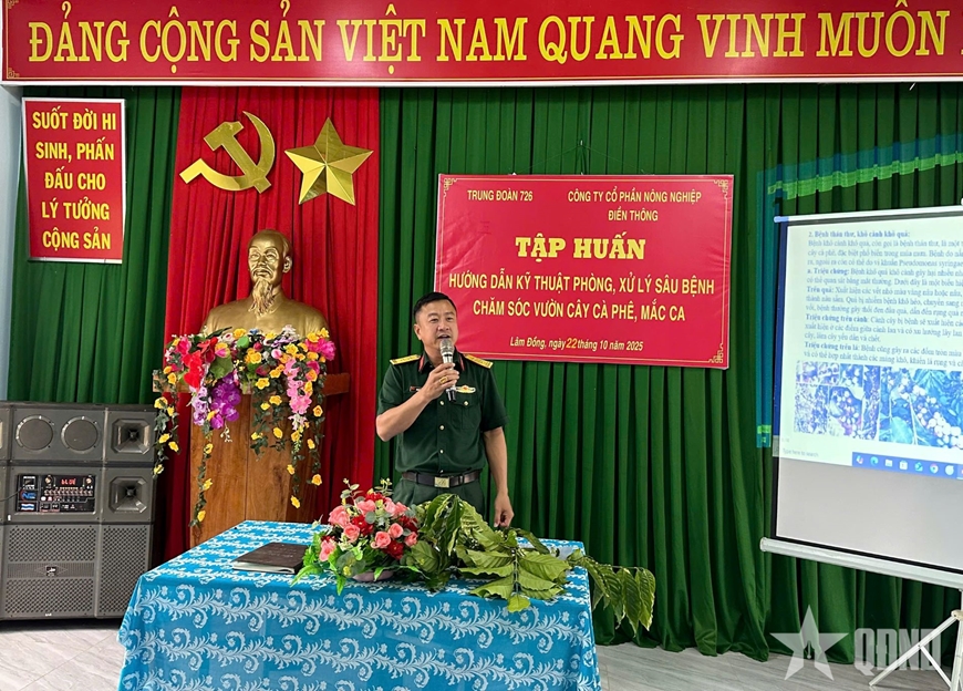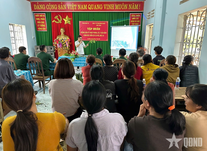 Trong hai ngày 22 và 23-10, tại xã biên giới Quảng Trực (tỉnh Lâm Đồng), Trung đoàn 726 (Binh đoàn 16) phối hợp với Công ty cổ phần nông nghiệp Điền Thông tổ chức tập huấn hướng dẫn kỹ thuật phòng, xử lý sâu bệnh chăm sóc vườn cây cà phê, mắc ca.