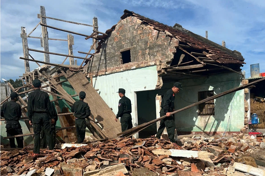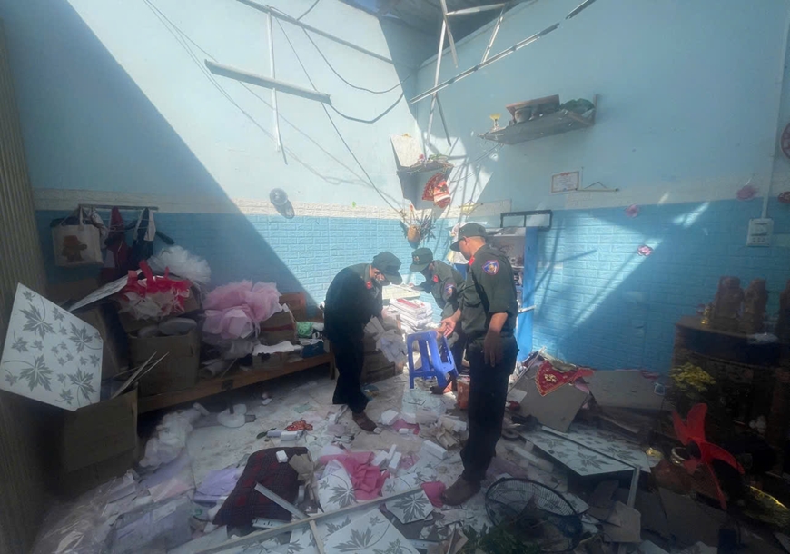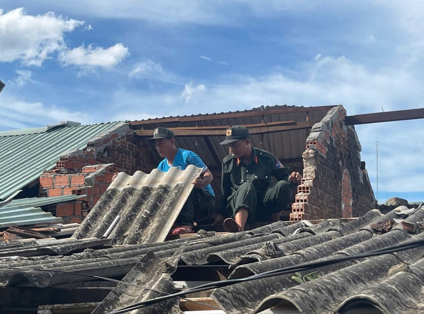 Cán bộ, chiến sĩ Trung đoàn CSCĐ Nam Trung Bộ phối hợp sửa chữa nhà dân bị tốc mái, đổ nghiêng.