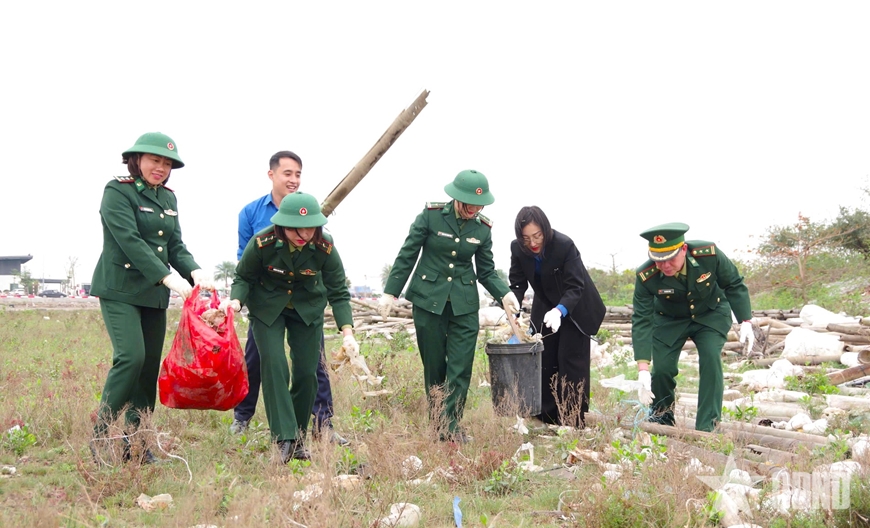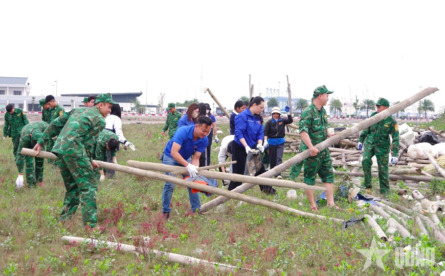 | Cán bộ, đoàn viên, thanh niên các đơn vị tích cực tham gia hưởng ứng chiến dịch “Hãy làm sạch biển” tại khu vực bến Phà, đặc khu Cát Hải. |