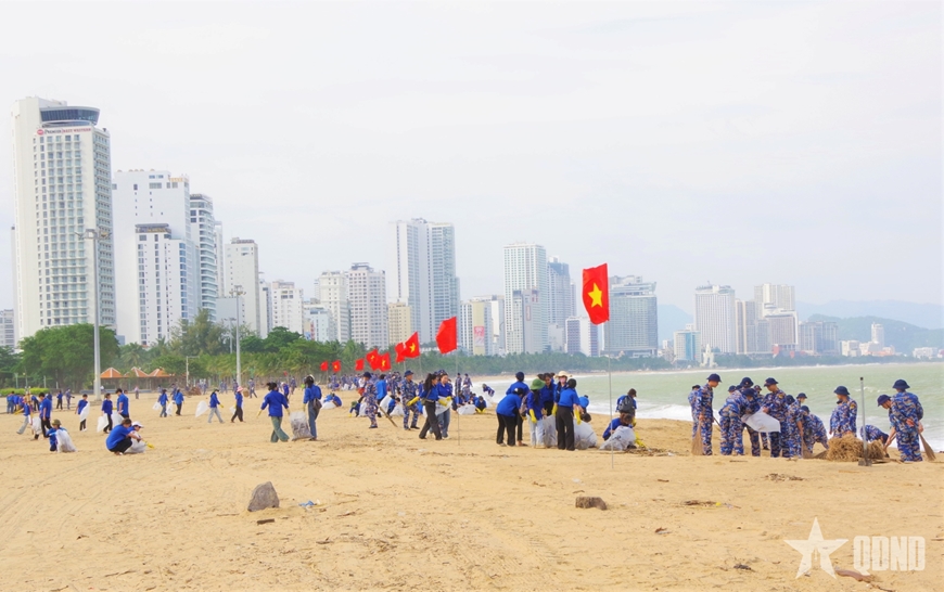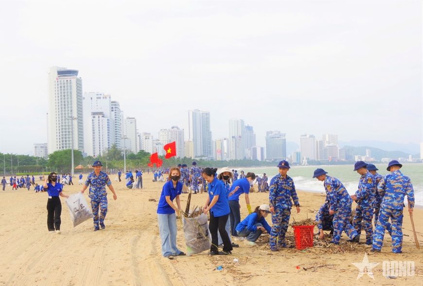 Cán bộ, đoàn viên Học viện Hải quân và Trường Đại học Khánh Hòa chung tay gom rác thải tại khu vực bãi biển.