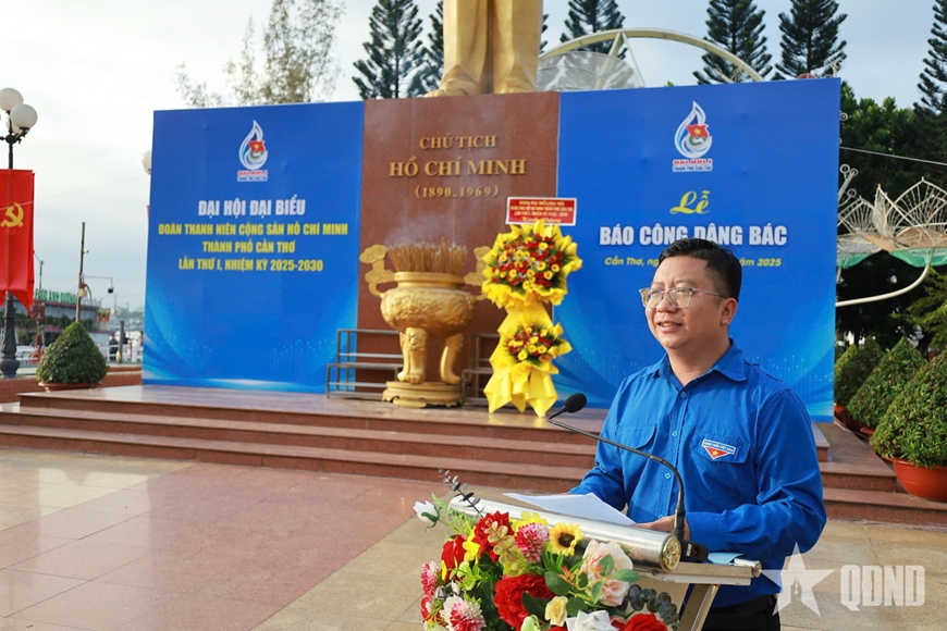 Thay mặt tuổi trẻ thành phố, anh Trần Việt Tuấn, Phó bí thư Thành đoàn Cần Thơ báo công dâng Bác những kết quả nổi bật của công tác Đoàn và phong trào thanh niên giai đoạn 2022-2025. Khắc ghi lời dạy của Bác “Đâu cần thanh niên có, việc gì khó có thanh niên”, tuổi trẻ Cần Thơ đã không ngừng phấn đấu, rèn luyện, phát huy tinh thần xung kích, sáng tạo, thi đua thực hiện hiệu quả nhiều phần việc ý nghĩa.