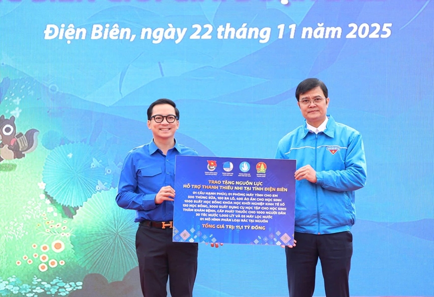 | Đồng chí Bùi Quang Huy trao tặng nguồn lực hỗ trợ thanh thiếu nhi tại tỉnh Điện Biên. |