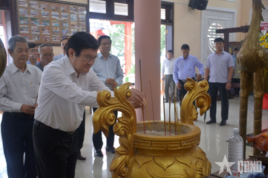 | Đồng chí Trương Tấn Sang và lãnh đạo địa phương dâng hương tưởng nhớ các anh hùng liệt sĩ. |