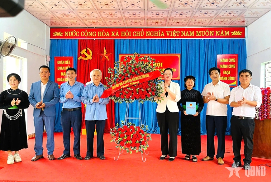 | Đồng chí Ma Thị Thúy, Phó trưởng Đoàn đại biểu Quốc hội chuyên trách tỉnh Tuyên Quang, tặng hoa chúc mừng nhân dân thôn Riềng. |