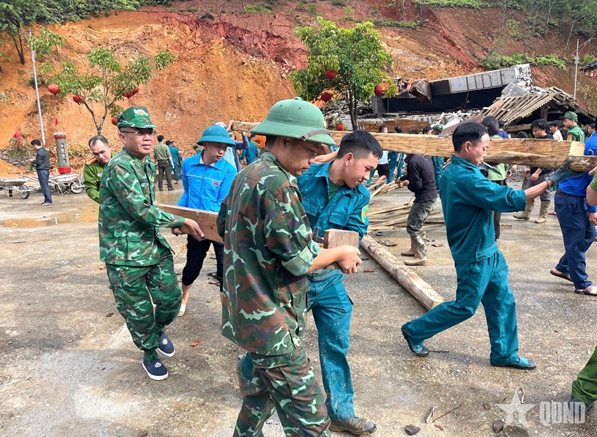 Lực lượng vũ trang địa phương tích cực tham gia khắc phục hậu quả, thu dọn hiện trường cổng chào xã Đồng Văn bị sập do sạt lở đất. |