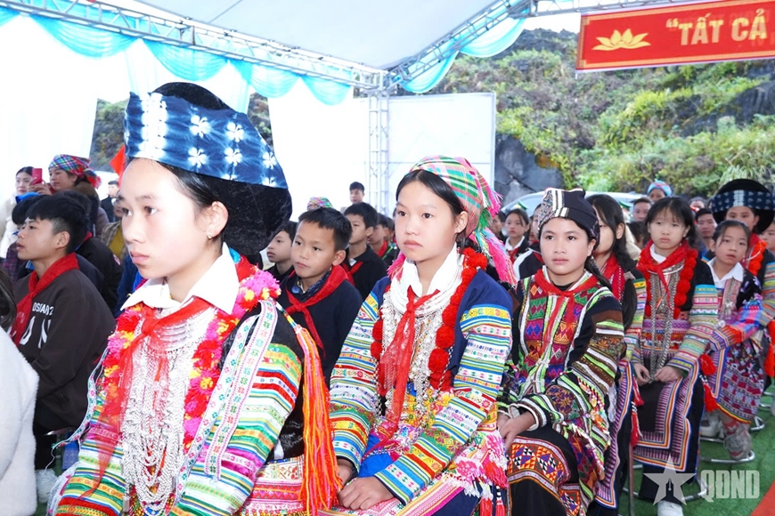| Học sinh xã Sơn Vĩ (Tuyên Quang) phấn khởi đến dự lễ khởi công. |