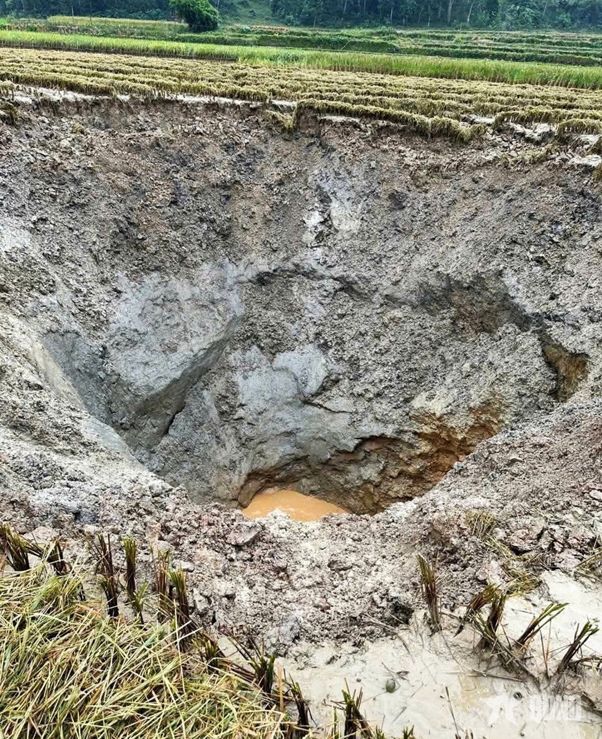 Sáng 6-10, xuất hiện hố sụt lớn trên ruộng của người dân thôn Bản Rắn, xã Ngọc Long (tỉnh Tuyên Quang). |