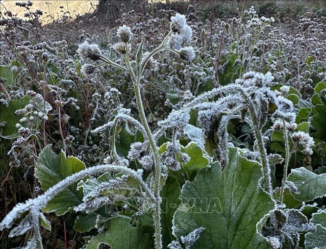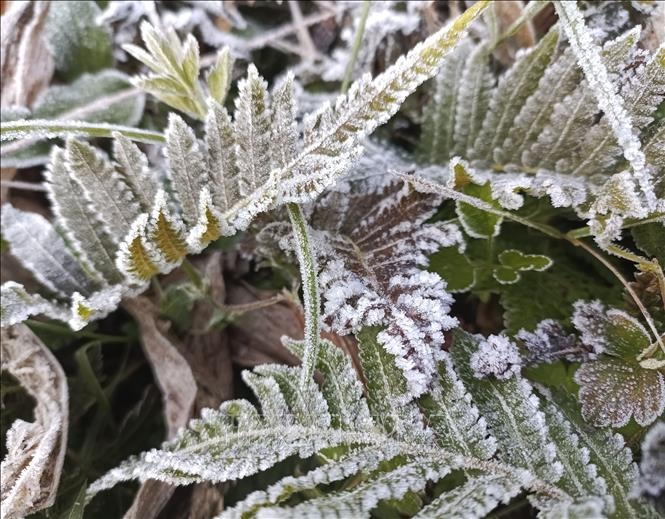 Sương muối tạo thành lớp băng mỏng trên cây cỏ.