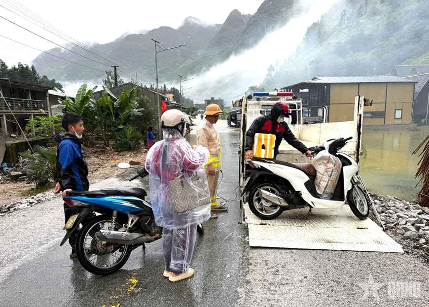 Cảnh sát giao thông Tuyên Quang hỗ trợ du khách và người dân qua điểm ngập tại thôn Pả Vi Hạ, xã Mèo Vạc. |