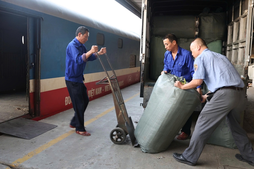 Nhân viên đường sắt vận chuyển hàng hóa cứu trợ để gửi đến các địa phương chịu ảnh hưởng thiên tai.