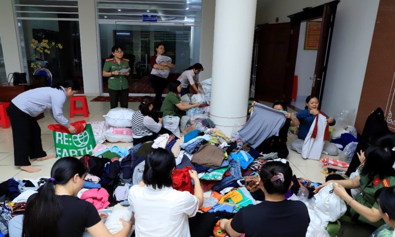 | Phụ nữ Công an tỉnh Đồng Nai phân loại quần áo, chăn màn để gửi cho đồng bào bị ảnh hưởng mưa lũ. |