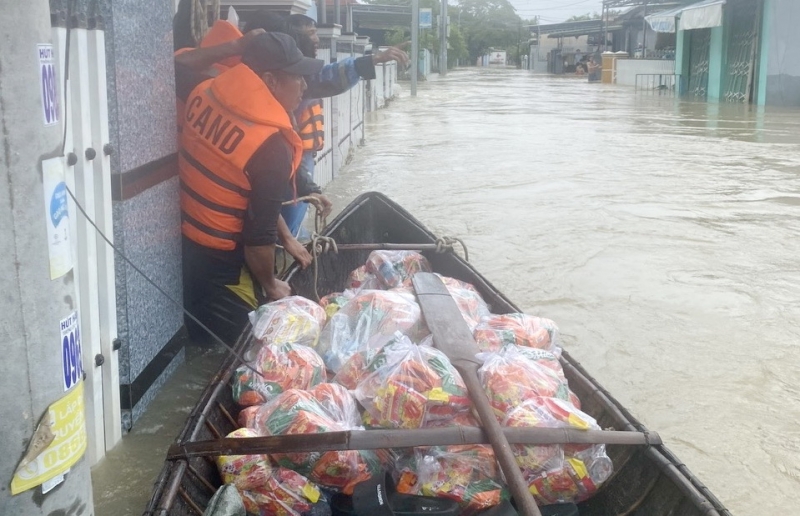 | Công an tỉnh Khánh Hòa đưa thực phẩm tiếp tế đến cho người dân những vùng bị lũ cô lập. |