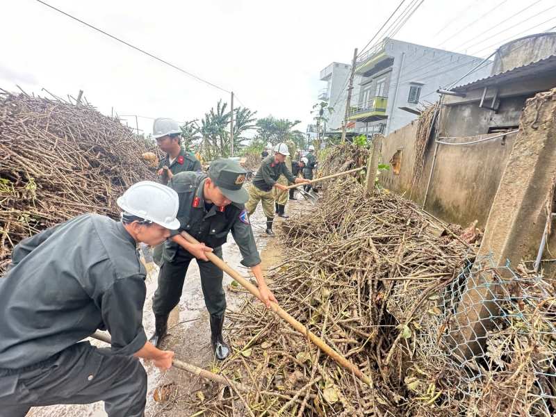 | Công an tỉnh Đắk Lắk thu dọn rác bẩn do lũ cuốn bồi lấp trên tuyến giao thông nông thôn ở xã Hòa Xuân. |