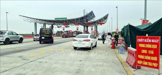 | Lực lượng chức năng làm nhiệm vụ hướng dẫn, phân luồng giao thông, khai báo y tế tại chốt trạm cầu Bạch Đằng, thị xã Quảng Yên, Quảng Ninh. Ảnh minh họa: TTXVN |