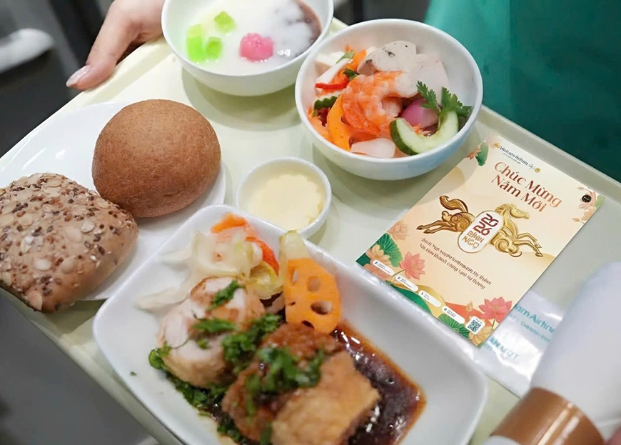 Vietnam Airlines mang hương vị Tết đến gần hơn với mỗi hành khách qua những món ăn, nơi vị giác được đánh thức qua hương vị quen thuộc của bánh chưng, xôi gấc, thịt đông… Mỗi món ăn được các đầu bếp của Vietnam Airlines chăm chút trong từng khâu chế biến và trình bày. Tất cả hòa quyện, tạo nên một bữa tiệc ẩm thực Tết ấm áp giữa những tầng mây.