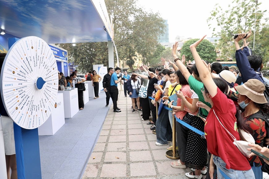 | Khách tham quan hào hứng tham gia các trò chơi minigame tại gian hàng Vietnam Airlines. |