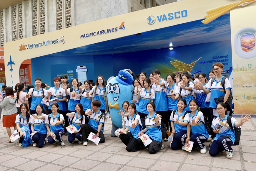| Các em học sinh vui vẻ lưu lại những khoảnh khắc đáng nhớ tại gian hàng Vietnam Airlines. |