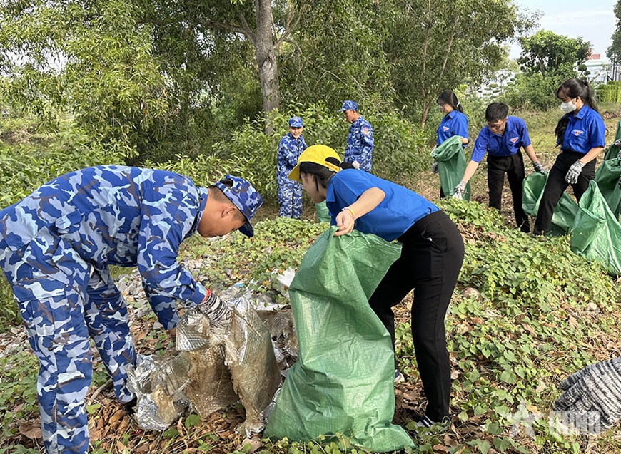 | Cán bộ, chiến sĩ Vùng Cảnh sát biển 3 cùng thanh niên địa phương thu gom rác thải. |