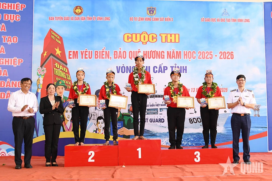 Lãnh đạo Vùng Cảnh sát biển 3 và đại diện địa phương trao giải nhất, nhì, ba tặng học sinh tỉnh Vĩnh Long.