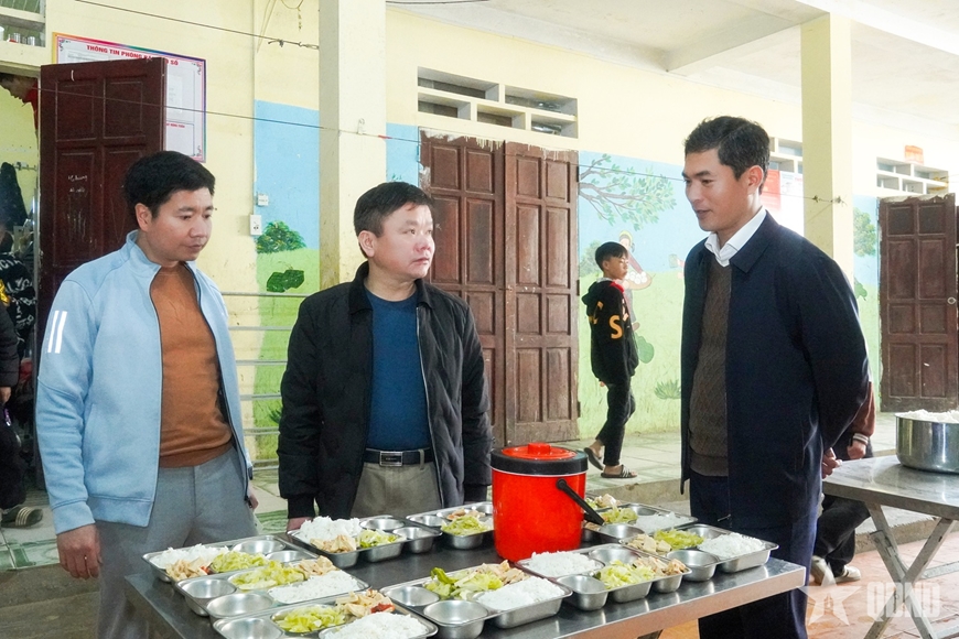 | Đồng chí Nguyễn Huy Sắc (đứng giữa) kiểm tra công tác bảo đảm bữa ăn bán trú cho học sinh trên địa bàn sau Tết. |