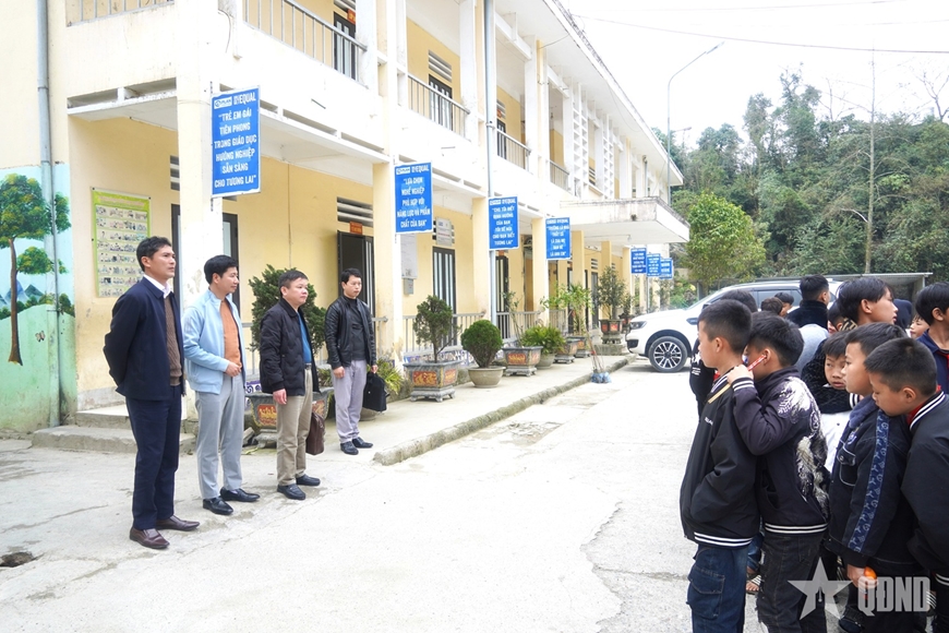 | Lãnh đạo xã Sơn Vĩ kiểm tra tình hình học tập của học sinh trên địa bàn sau Tết. |