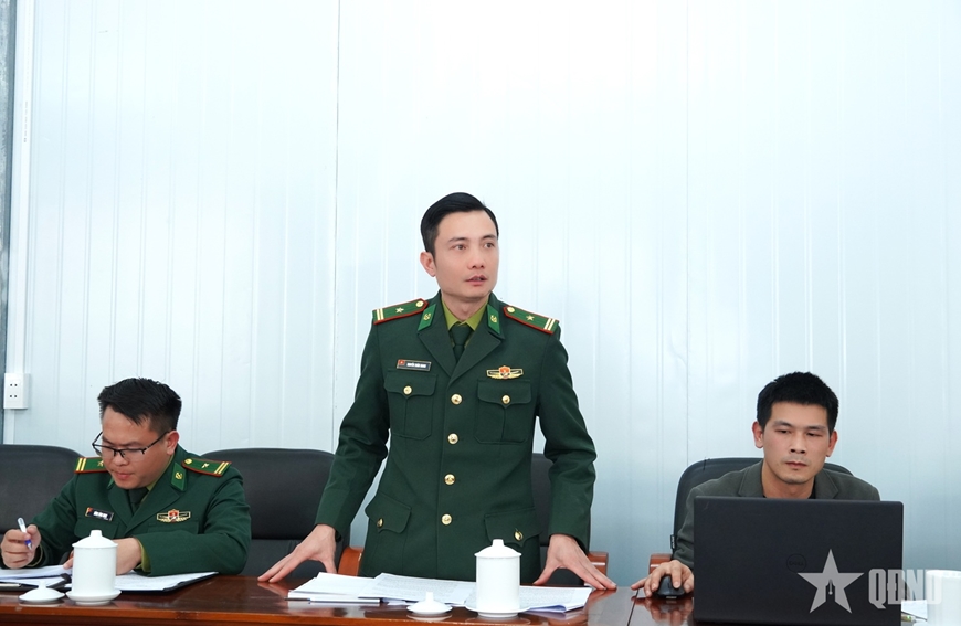 | Thiếu tá Nguyễn Xuân Giang, Đồn trưởng Đồn Biên phòng Cửa khẩu Săm Pun phát biểu tại cuộc họp. |
