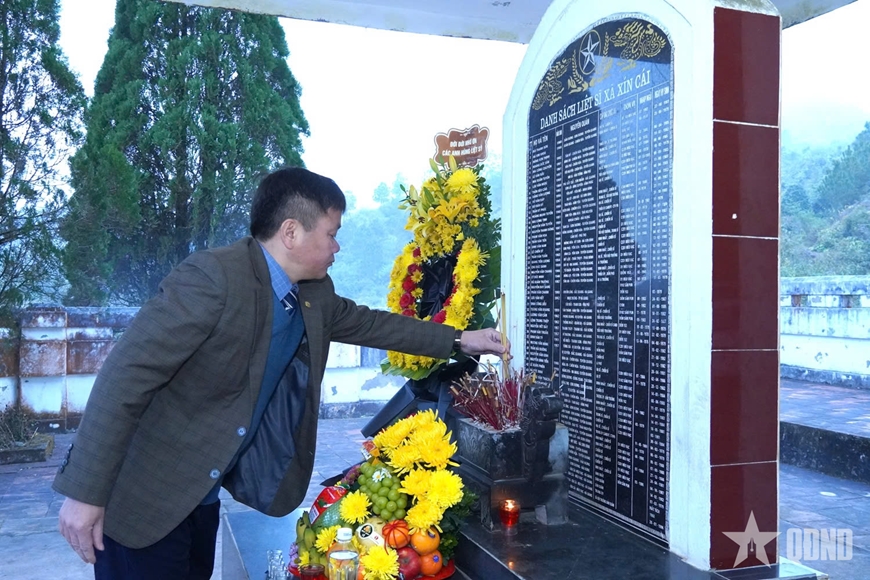 | Đồng chí Nguyễn Huy Sắc, Bí thư Đảng ủy, Chủ tịch HĐND xã Sơn Vĩ (tỉnh Tuyên Quang) dâng hương tưởng niệm các anh hùng liệt sĩ tại Đài tưởng niệm các anh hùng liệt sĩ xã Sơn Vĩ. |