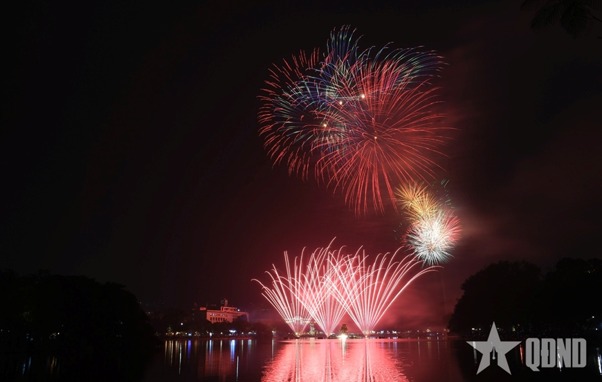Pháo hoa rực rỡ trên bầu trời hồ Hoàn Kiếm, chào đón năm mới 2026.