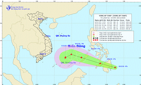 Từ 7 giờ ngày 19-12 đến 7 giờ ngày 20-12, vùng áp thấp di chuyển theo hướng Tây Tây Bắc, mỗi giờ đi được 20-25km vào Biển Đông và có khả năng mạnh lên thành áp thấp nhiệt đới. Vị trí tâm áp thấp nhiệt đới ở khoảng 10,1 độ Vĩ Bắc; 117,8 độ Kinh Đông, cách đảo Song Tử Tây (quần đảo Trường Sa) khoảng 400km về phía Đông Đông Nam. Sức gió mạnh nhất vùng gần tâm áp thấp nhiệt đới mạnh cấp 6-7 (40-60km/giờ), giật cấp 9.