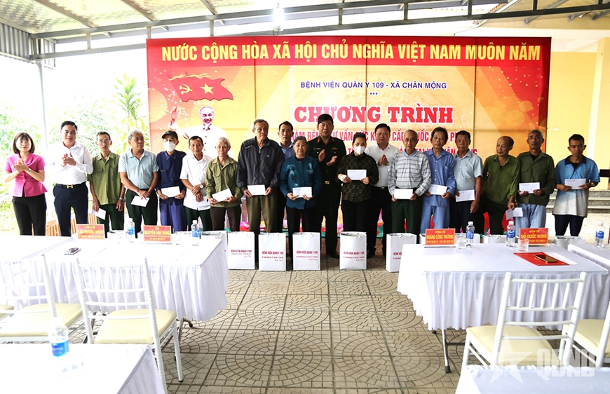 Trong đợt khám bệnh lần này, đội ngũ thầy thuốc Bệnh viện Quân y 109 phối hợp với Trạm y tế xã Chân Mộng triển khai hệ thống phòng khám, với đầy đủ các chuyên khoa, như: Răng, hàm, mặt, mắt, tai - mũi - họng; tim mạch; cơ xương, khớp. Sau một ngày nỗ lực, các thầy thuốc quân y, bác sĩ, nhân viên y tế khám bệnh, tư vấn sức khỏe, cấp phát thuốc miễn phí cho gần 700 lượt đối tượng chính sách, hộ nghèo trên địa bàn. Dịp này, Bệnh viện Quân y 109 đồng thời trao 20 suất quà (mỗi suất trị giá 500.000 đồng) tặng đối tượng chính sách, hộ nghèo tiêu biểu ở địa phương.