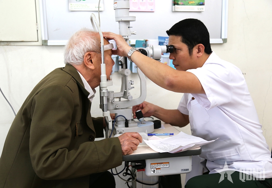 | Cựu chiến binh Kiều Tiến Thau được bác sĩ Bệnh viện Quân y 109 khám các bệnh lý về mắt. |