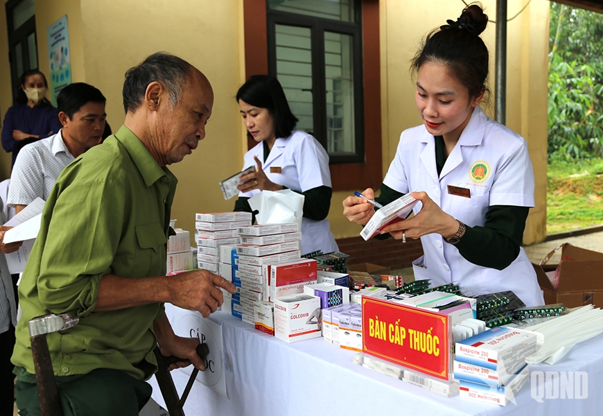 | Dược sĩ, Trung tá QNCN Nguyễn Thị Hồng Thúy hướng dẫn một cựu chiến binh cách sử dụng thuốc. |