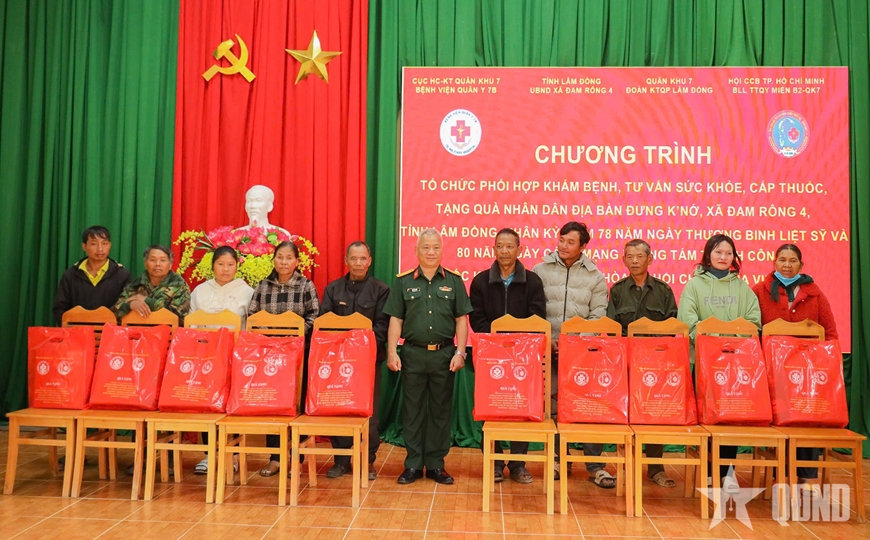 Đại diện Ban giám đốc Bệnh viện 7B tặng quà đến người dân hoàn cảnh khó khăn trong chương trình khám bệnh, cấp thuốc tại Lâm Đồng. Ảnh: HÀ NGỌC |
