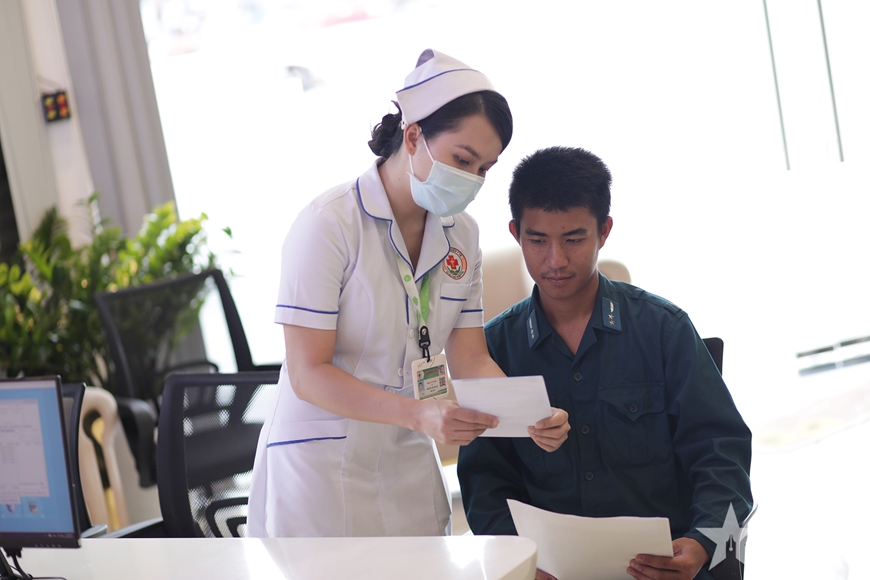 Các bác sĩ tận tình thăm khám, hướng dẫn thủ tục đối với bệnh nhân là quân nhân. Ảnh: HÀ NGỌC |