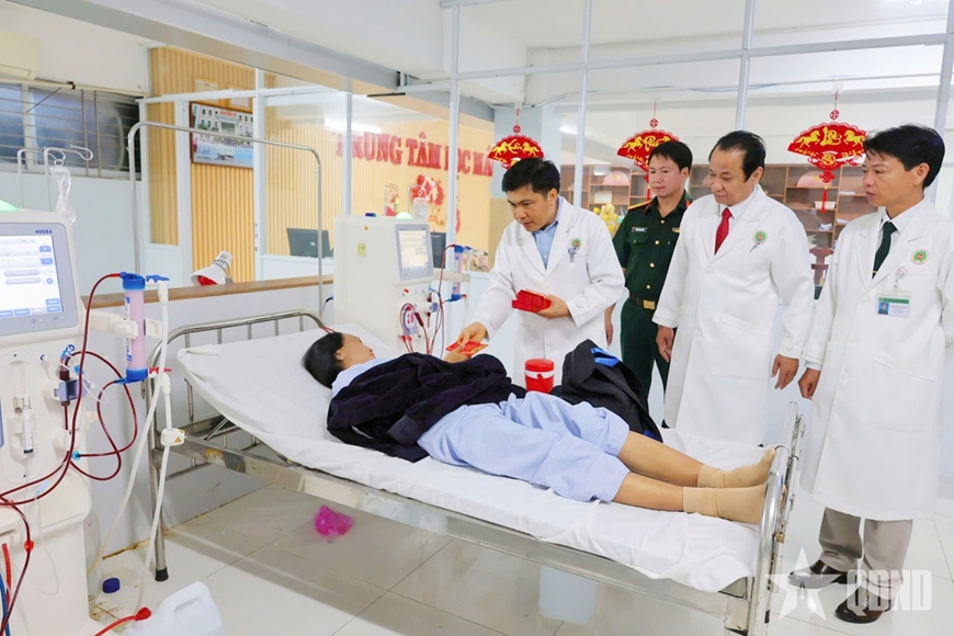 | Lãnh đạo Bệnh viện Quân y 121 thăm hỏi, tặng quà các bệnh nhân đang nằm điều trị. |