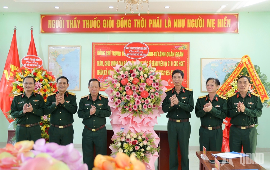 Dịp này, Trung tướng Đào Tuấn Anh tặng hoa và gửi lời chúc mừng tốt đẹp đến đội ngũ cán bộ, y, bác sĩ Bệnh viện Quân y 211; lãnh đạo Cục Chính trị, Cục Hậu cần - Kỹ thuật (Quân đoàn 34) cũng tặng hoa chúc mừng Bệnh viện Quân y 211.