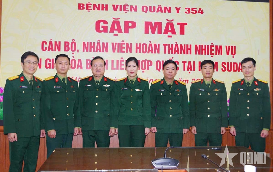 | Lãnh đạo, chỉ huy Bệnh viện Quân y 354 cùng các đồng chí cán bộ, nhân viên hoàn thành nhiệm vụ gìn giữ hòa bình Liên hợp quốc tại Nam Sudan. |