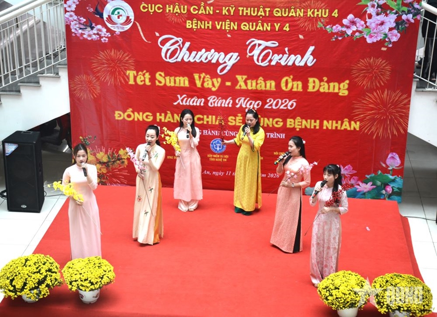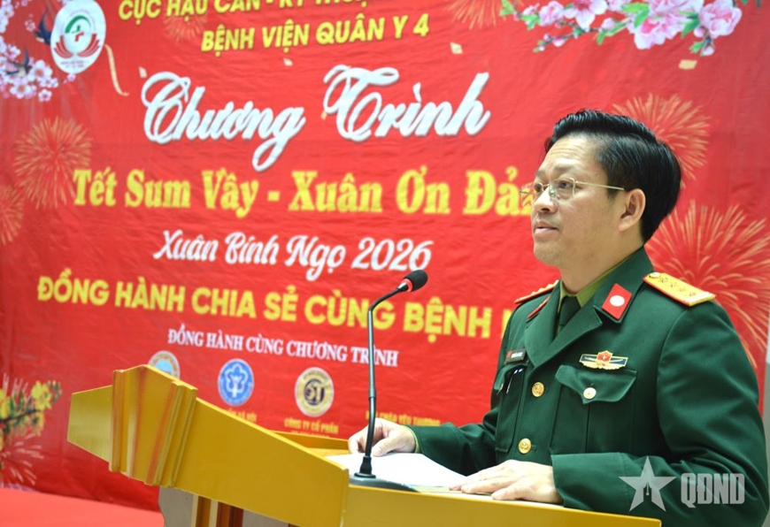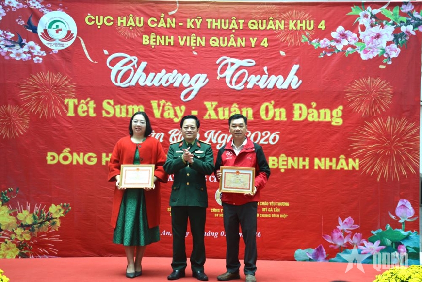 Phát biểu tại chương trình, Đại tá Nguyễn An Giang, Giám đốc Bệnh viện Quân y 4 nhấn mạnh: “Trong không khí phấn khởi, vui tươi đón Tết cổ truyền Bính Ngọ 2026 và chào mừng thành công Đại hội XIV của Đảng, để góp phần thực hiện tốt chủ trương của Đảng, Nhà nước, Quân đội về chăm lo đời sống, bảo đảm an sinh xã hội cho người dân và cán bộ, chiến sĩ, trong dịp Tết Nguyên đán Bính Ngọ năm 2026 “Không để ai bị bỏ lại phía sau”, Bệnh viện Quân y 4 tổ chức Chương trình “Tết sum vầy - Xuân ơn Đảng”, kịp thời động viên, chia sẻ những khó khăn của bệnh nhân, vượt qua bệnh tật, sớm trở về với gia đình; đồng thời là nghĩa cử cao đẹp của cán bộ, chiến sĩ LLVT Quân khu 4, Bệnh viện Quân y 4 và các nhóm thiện nguyện, các nhà hảo tâm.