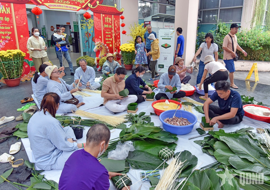 | Các thầy thuốc Bệnh viện Quân y 175 cùng bệnh nhân quây quần bên nhau chuẩn bị những chiếc bánh chưng xanh cho ngày Tết cổ truyền. |