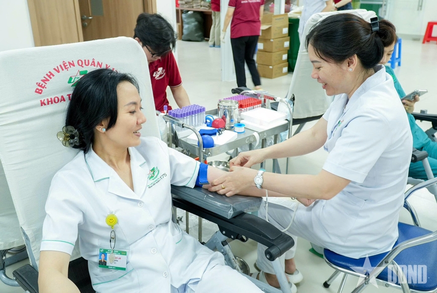 | Cán bộ, nhân viên Bệnh viện Quân y 175 tham gia hiến máu tình nguyện nhằm chủ động bảo đảm nguồn máu dự trữ an toàn, ổn định phục vụ công tác cấp cứu và điều trị người bệnh trong dịp Tết Nguyên đán. |