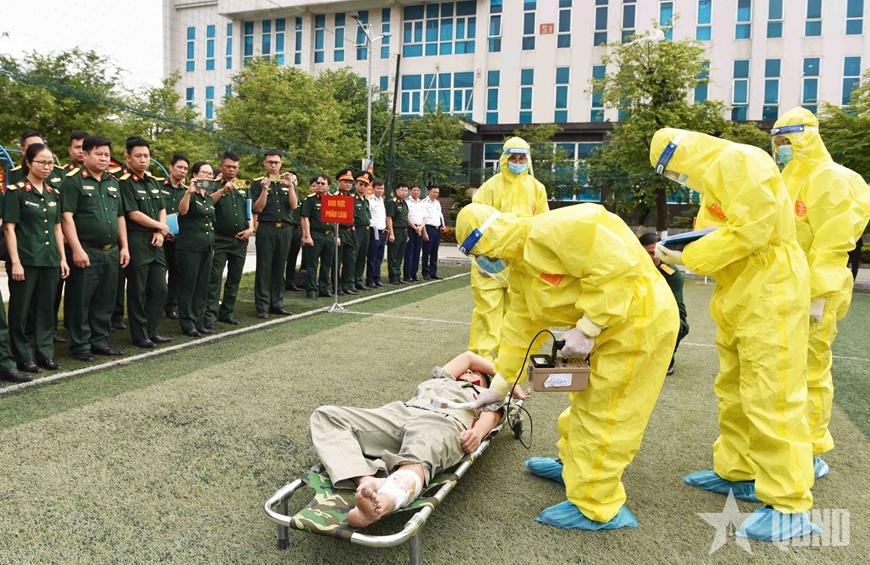 Ngay sau buổi khai mạc, các đại biểu và học viên tham quan đội hình mẫu thực hiện hành động diễn tập cấp cứu nhiễm xạ tiếp nhận, phân loại, cấp cứu, tẩy xạ và tổ chức chuyển nạn nhân về tuyến sau.