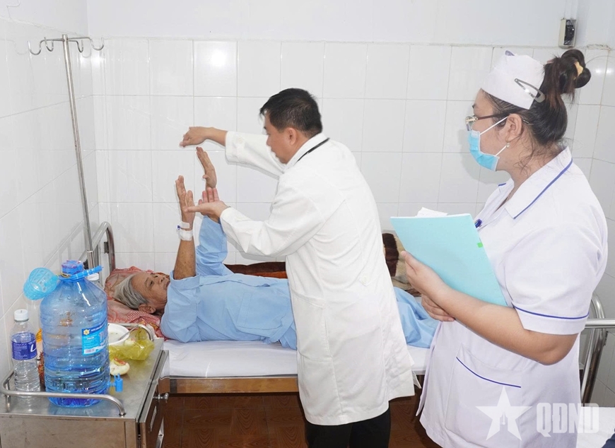Y, bác sĩ Bệnh viện Quân y 120, Cục Hậu cần - Kỹ thuật Quân khu 9 thăm, khám bệnh nhân điều trị bệnh đột quỵ. |