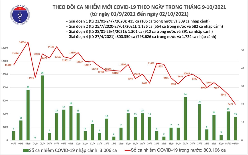 Tình hình dịch tại Việt Nam, kể từ đầu dịch đến nay Việt Nam có 803.202 ca nhiễm, đứng thứ 43/223 quốc gia và vùng lãnh thổ, trong khi với tỷ lệ số ca nhiễm/1 triệu dân, Việt Nam đứng thứ 155/223 quốc gia và vùng lãnh thổ (bình quân cứ 1 triệu người có 8.160 ca nhiễm). Đợt dịch thứ 4 (từ ngày 27-4 đến nay), ghi nhận trong nước là 798.626 ca, trong đó có 659.759 bệnh nhân đã được công bố khỏi bệnh. Có 12/62 tỉnh, thành phố đã qua 14 ngày không ghi nhận trường hợp nhiễm mới trong nước: Bắc Kạn, Tuyên Quang, Lai Châu, Hòa Bình, Yên Bái, Hà Giang, Thái Nguyên, Điện Biên, Hải Phòng, Ninh Bình, Thái Bình, Lạng Sơn. Có 7 tỉnh, thành phố không có ca lây nhiễm thứ phát trên địa bàn trong 14 ngày qua: Quảng Ninh, Lào Cai, Vĩnh Phúc, Bắc Giang, Phú Thọ, Bắc Ninh, Nam Định. Các địa phương ghi nhận số nhiễm tích lũy cao trong đợt dịch này: TP Hồ Chí Minh (395.052), Bình Dương (214.360), Đồng Nai (49.839), Long An (32.682), Tiền Giang (14.107).